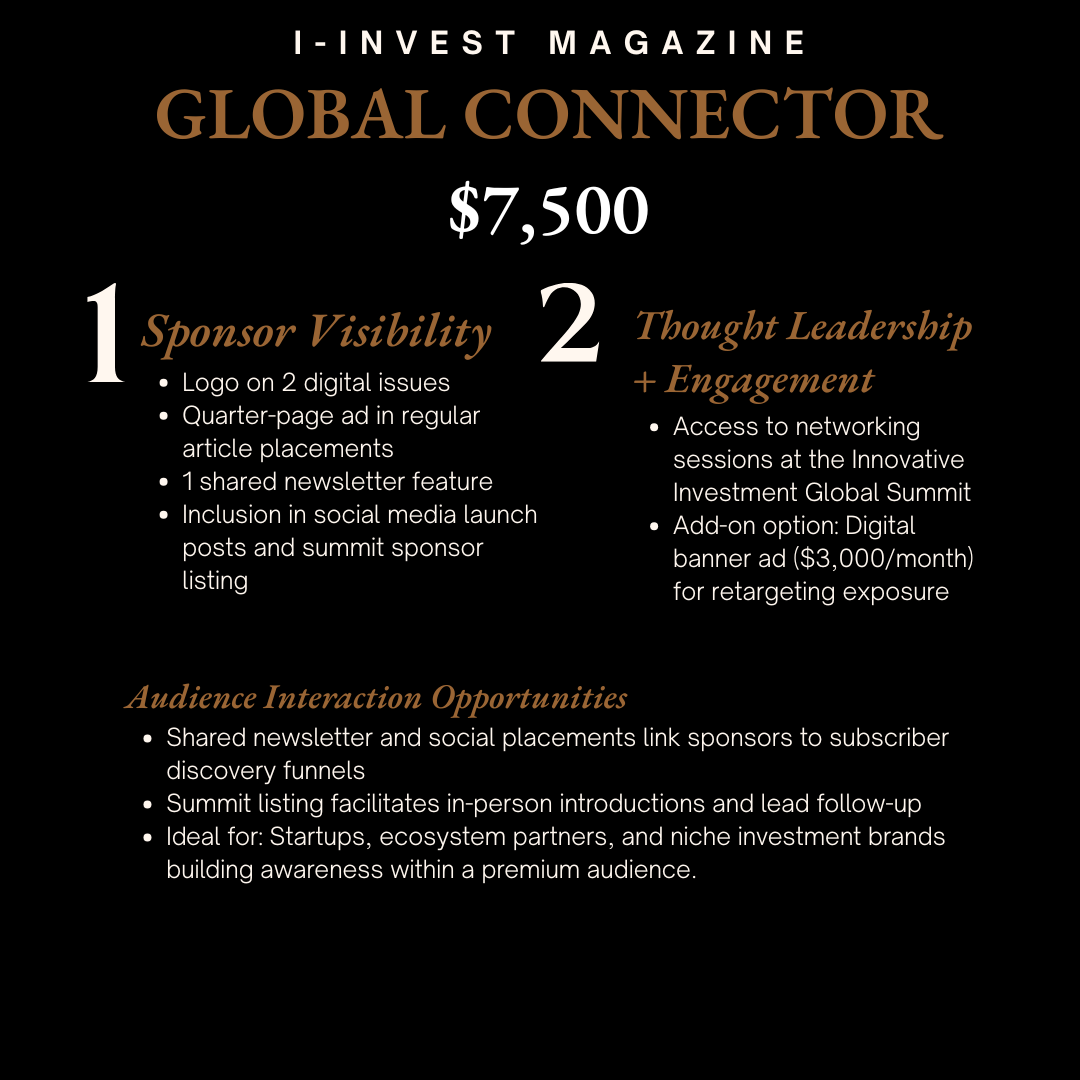 | Global Connector Silver | $7,500 | Shared | 50,000+ | Sponsor Mentions | Summit Networking |